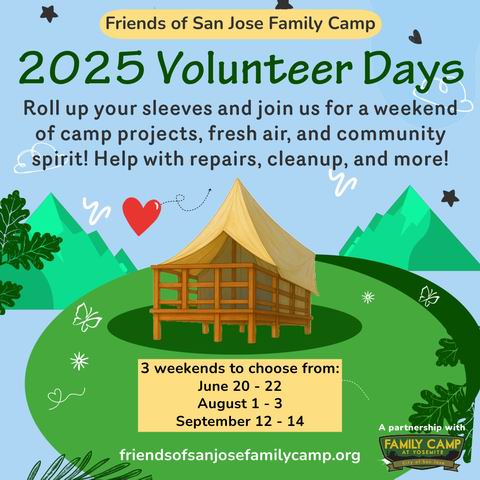 Welcome to the sign-up page for the 2025 Volunteer Days (formerly Work Parties). The Friends of San Jose Family Camp ("Friends") in partnership with the City of San Jose, have put together a special session of volunteer opportunities for 2025 while Family Camp at Yosemite is closed as major construction projects take place at camp this year.