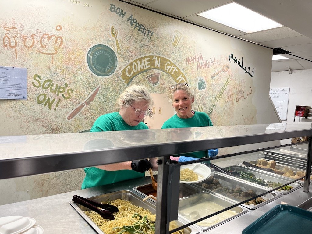 Margo and Kristi serving dinner